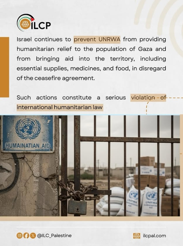 Israel continues to block UNRWA from delivering humanitarian aid to Gaza, including food and medicine, in disregard of the ceasefire—constituting a serious violation of international humanitarian law