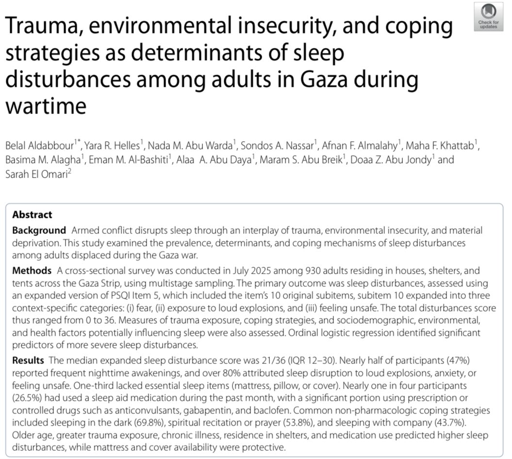 New research shows the war in Gaza is deeply disrupting everyday life, with adults facing severe sleep disturbances linked to trauma, fear, loud explosions, and unsafe living conditions. Nearly half wake up most nights, and many lack basic sleep essentials like mattresses and covers. Coping strategies range from prayer and darkness to sleep medications