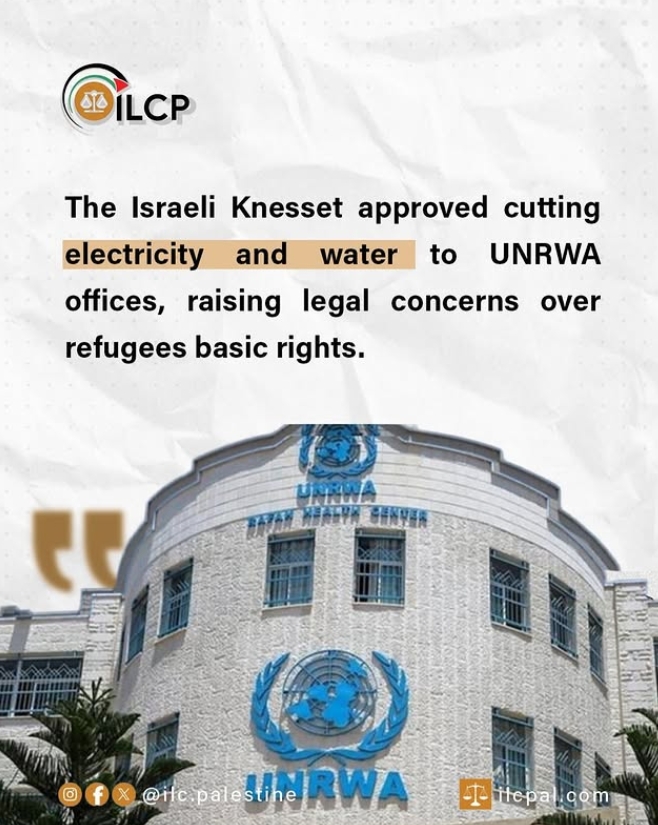 The Israeli Knesset’s decision to cut electricity and water to UNRWA offices raises serious concerns regarding the violation of the fundamental rights of refugees under international law,