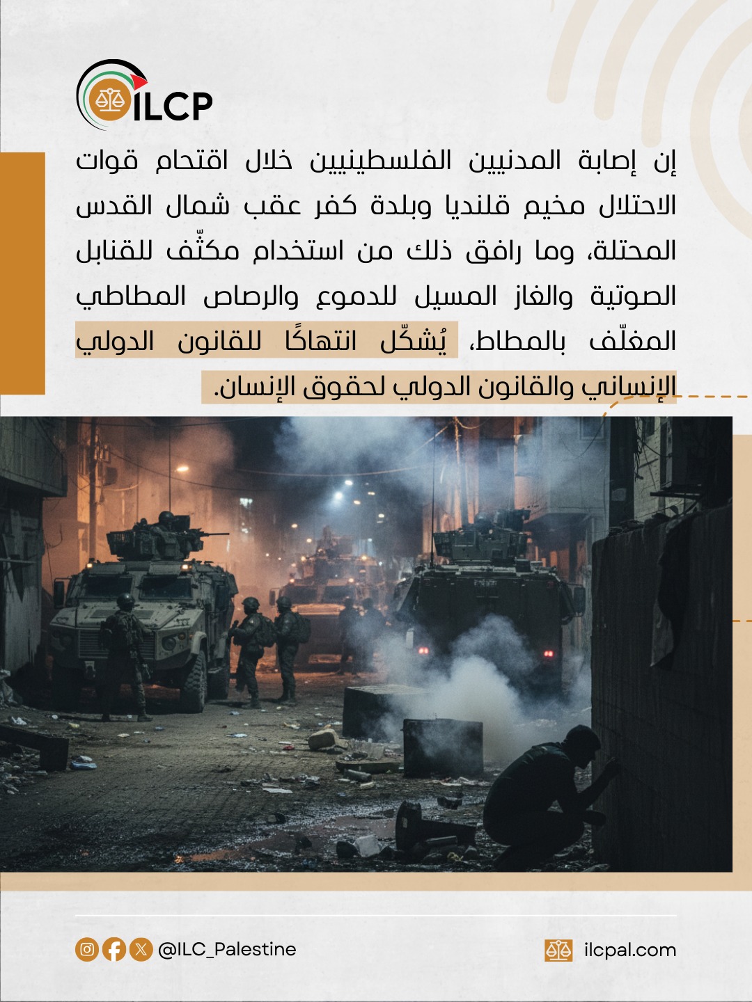 يشكل استهداف المدنيين وإصابتهم خلال المداهمات، والاستخدام المفرط للقوة، انتهاكاتٍ صريحةً للقانون الدولي الإنساني والقانون الدولي لحقوق الإنسان.