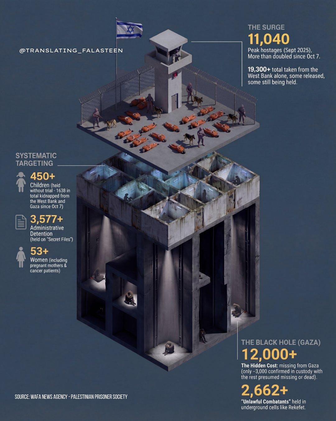 Over 19,300 Palestinians were taken from the West Bank and Jerusalem, while Gaza saw thousands disappear into what rights groups describe as “the Black Hole,” with 12,000+ missing, only a fraction officially acknowledged in custody. Children, women, and the sick have not been spared: 450+ children, 3,577+ administrative detainees held indefinitely without trial, and 53+ women, including pregnant women and cancer patients. Underground facilities such as Rekefet hold 2,662+ Palestinians labeled “unlawful combatants,” isolated from lawyers and daylight. Even after limited hostage-exchange releases in late 2025, the number of KNOWN hostages remains around 9,500, reflecting an entrenched system designed for the removal and disappearance of an entire population