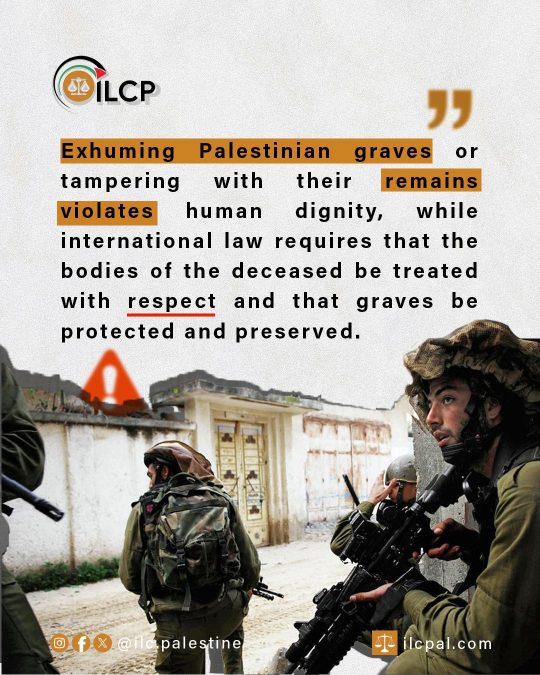 Exhuming Palestinian graves or tampering with remains is a violation of human dignity. International law mandates respect for the deceased and the protection of graves