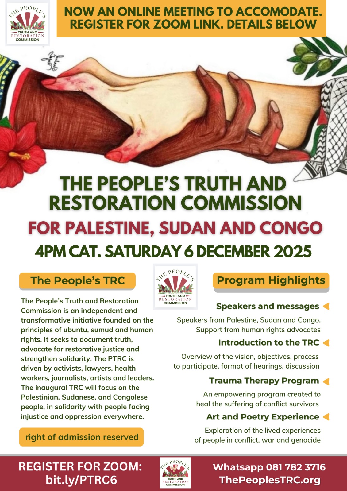 لجنة الحقيقة والاستعادة الشعبية مبادرة مستقلة وتحويلية، مبنية على مبادئ أوبونتو والصمود وحقوق الإنسان. تسعى إلى توثيق الحقيقة، والدعوة إلى العدالة التصالحية، وتعزيز التضامن. ستركز لجنة الحقيقة والاستعادة الشعبية في دورتها الافتتاحية على الشعب الفلسطيني والسوداني والكونغو.