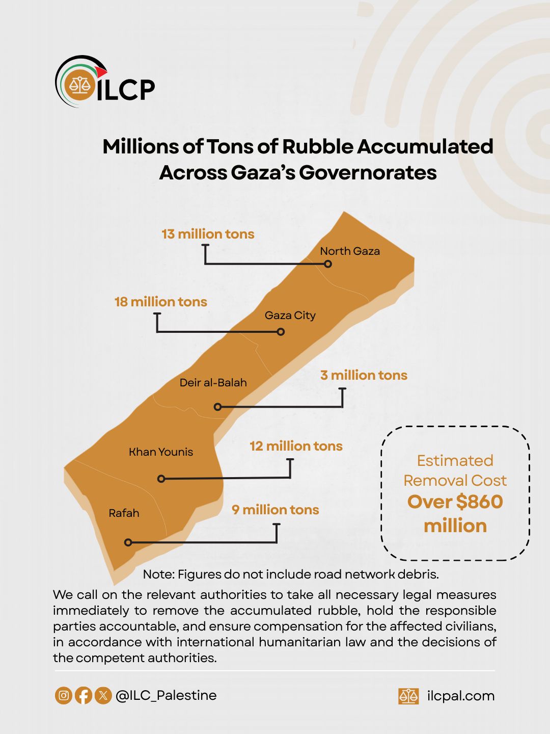 The massive accumulation of millions of tons of rubble across Gaza’s governorates poses a severe humanitarian and environmental threat
